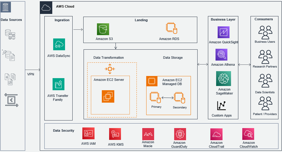 - The data ingestion can be batch, near real-time, or streaming based on need of the data provider, and can vary based on the use case. For example, either AWS DataSync or AWS Transfer Family can be used for transfer. In either case, the data is transferred securely with encryption during transit and at rest.