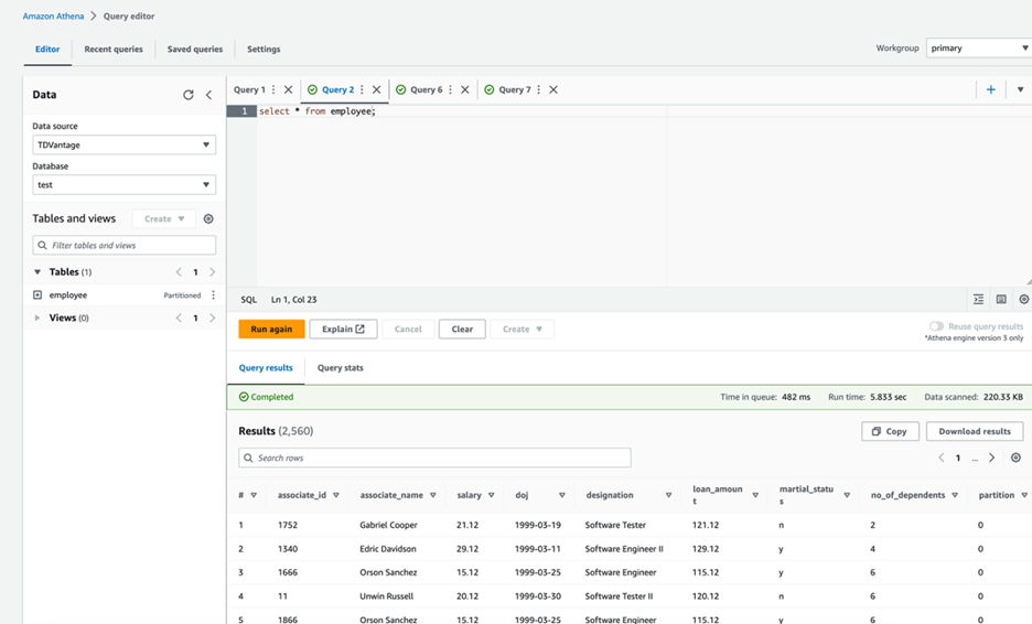 Amazon Athena can run federated queries for data residing in different data sources. In this tutorial, we’ll join the employee table from Teradata Vantage to a customer file on Amazon S3 to retrieve relevant information. Any tabular dataset can be used for this exercise.