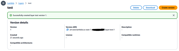 - On the details page for the layer, copy the layer Amazon Resource Name (ARN) by choosing the clipboard icon at the top of the page.
