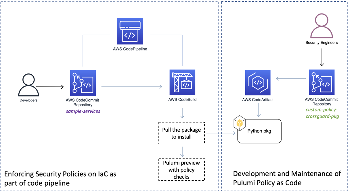 This post is accompanied by sample code hosted in GitHub that provides code for the workflows. For detailed instructions on using the code, see the README file. First, we’ll give a brief explanation of policy-as-code and Pulumi.