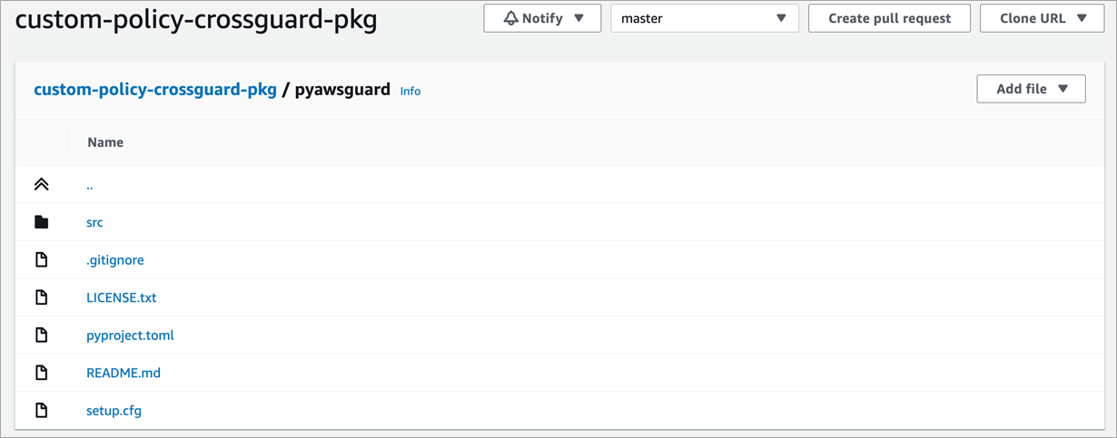As mentioned above, you will need to create a new CodeCommit repository for your custom compliance rules. You can clone the GitHub repo and copy the sample Python package to your new CodeCommit repository.