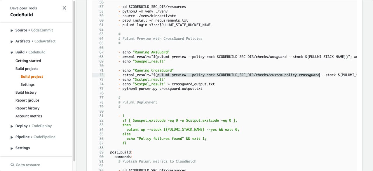 Next, it’s time to include the policy packs to the DevOps tools and achieve continuous compliance. We need to include the above steps in the buildspec.yaml file of a CodeBuild project. You can find the buildspec.yaml example in GitHub.