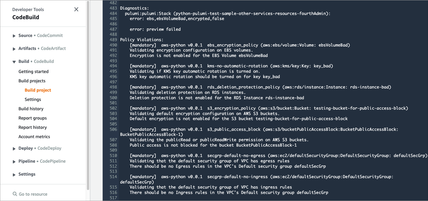 Figure 6 – Output of policy packs preview in AWS CodeBuild.