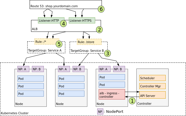 Target groups [3] are also created, one per Kubernetes service that will use the load balancer. At [4], listeners are created, which expose the service on a specific port on the load balancer. Routing rules [5] are configured, which specify the correlation between URL paths and backend target groups.