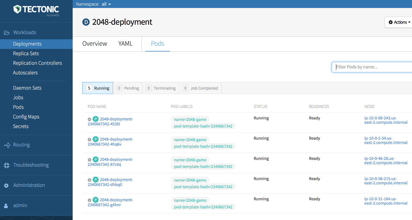 Using the Tectonic console, I can make sure I have my five replicas running: