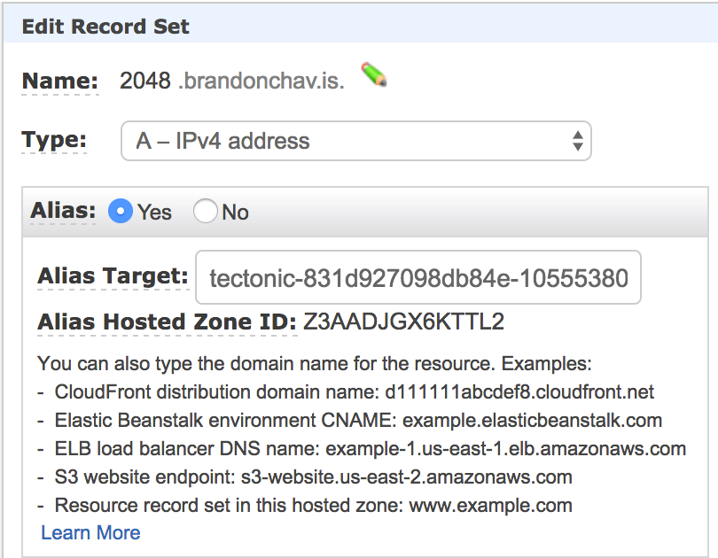 Here, we need to specify the scheme we want for our load balancer (internal or Internet-facing), which subnets it should live in, the security group that should be applied to it, and the Route 53 subdomain we’d like it to create for us.