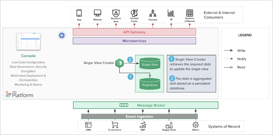 The Projection Real-Time Updater can notify other microservices of the data that has been changed, with the goal of enabling the creation of single views. A single view is an aggregation of data from multiple SORs and different entities available to any clients that will request it.