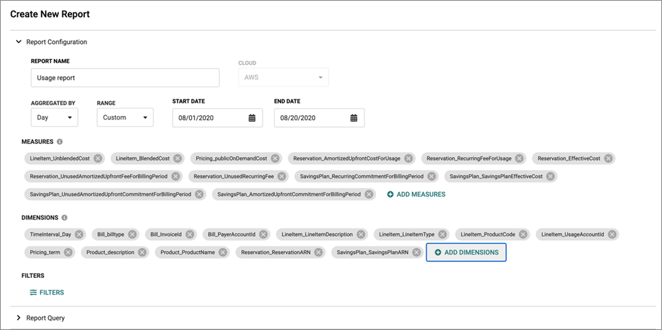 Please note that the naming convention used in the following implementation applies the naming convention used in FlexReports, which is similar to the naming format of the AWS Cost and Usage Report.