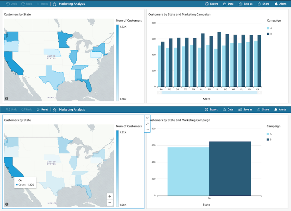 Figure 5 – Amazon QuickSight dashboard showing A/B test data across the U.S. (top) and California (bottom).