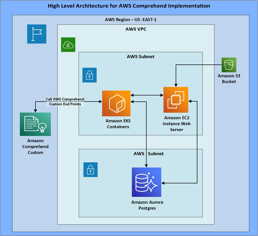 The sample architecture for implementing Amazon Comprehend is simple and minimalistic. It requires only two Amazon Elastic Compute Cloud (Amazon EC2) or containers, depending of your business needs: one for hosting the Python code, and one for hosting the user experience and user interface, depending on business needs.