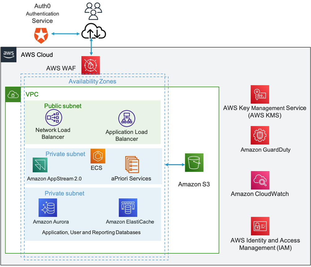 Third-party provider Auth0 supports multi-factor authentication (MFA) and federated single sign-on (SSO) support for additional user security. All aPriori applications use HTTPS or secure web socket communication. AWS WAF combined with Elastic Load Balancing protects the environment from application-layer exploits and balances traffic across multiple aPriori container-based services.