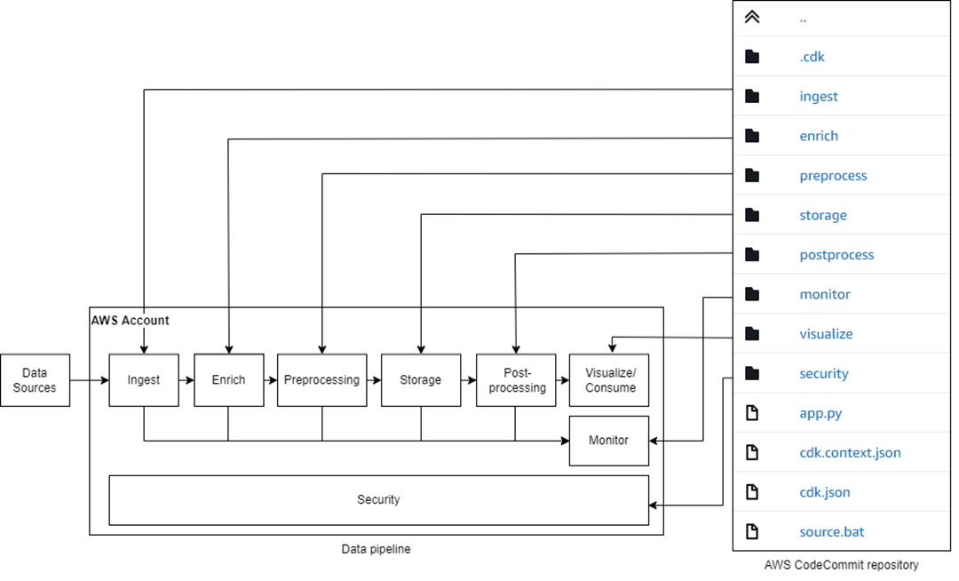 As shown in Figure 3, different layers are mapped to different AWS CDK stacks within a single repository. The repository contains an AWS CDK application composed of stacks. The modularity of the stacks is designed for the reusability of the code by having a division of stages (or layers) in different folders. The image shows how architecture components are allocated in folders, each containing CDK pieces.