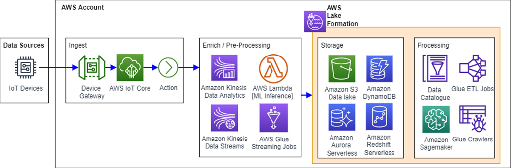 In the context of IoT, Storm Reply adopts an AWS serverless data analytics reference architecture for modern, secure, and scalable IoT analytics platforms. This platform includes ingestion, enrichment, and processing pipelines, a data lake, and a consumption layer for visualization and analysis. This reference architecture enables real-time analytics through Amazon Kinesis Data Analytics and Amazon QuickSight.