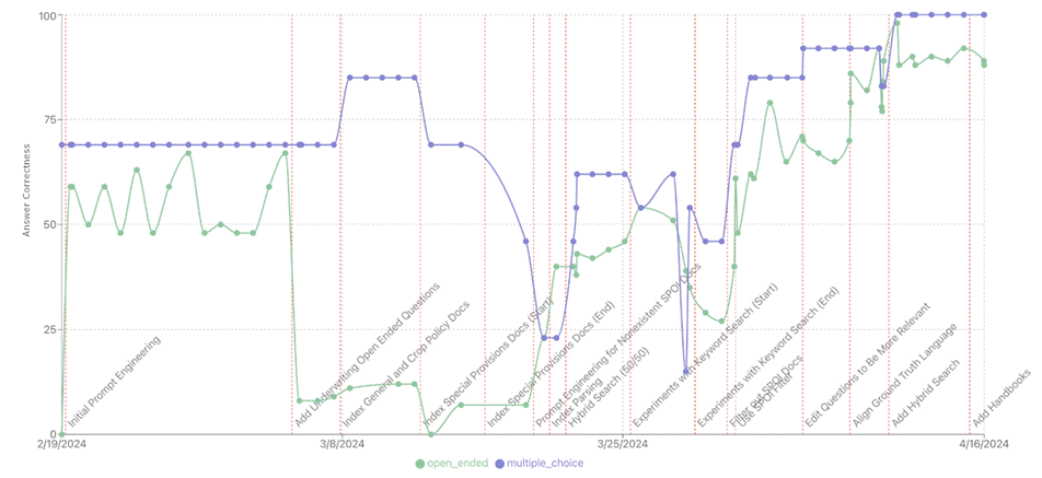 Source Allies monitored this solution by plotting it on a time-series graph to track the answer correctness of different questions over time. Figure 2 shows the answer correctness scores over time for both open-ended and multiple-choice questions. “Milestones” indicated at specific times represent actions like underlying data changes and experiments with document indexing, retrieval, and inference.