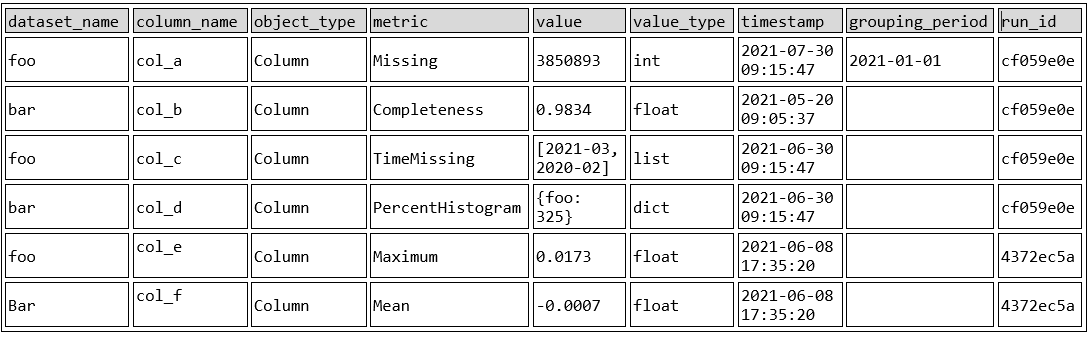 The generated profile records all metrics in a single table (see below) which is used by both DQC and ADA for automation and decision recommendation purpose, as well as for both Elula’s data engineers and data scientists. This single source of truth enables the team to run any ad-hoc analysis over time, over datasets, and over products, and quickly pinpoint the source of the data quality issue.
