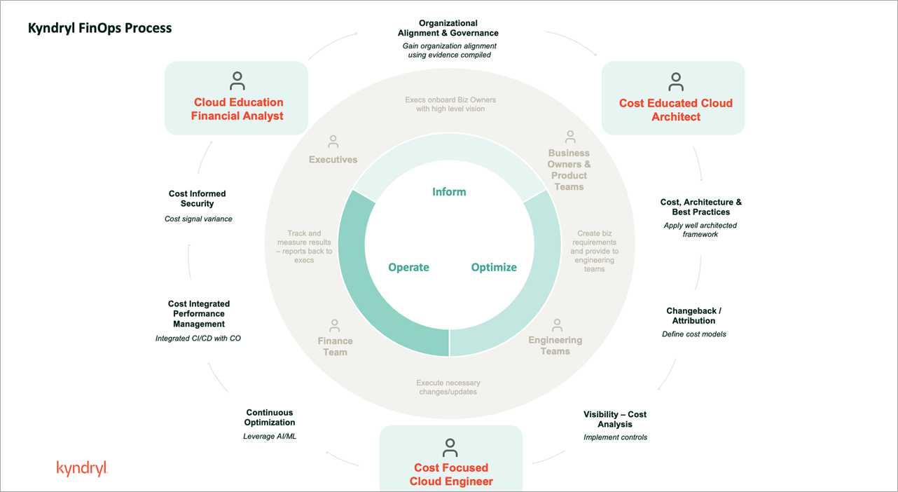 - Operate and optimize: Once the FinOps model is defined and adopted, Kyndryl continues to monitor and optimize the solution, ensuring your organization is always getting maximum value. As a managed service provider, Kyndryl offers various levels of support focused on adoption and continuous improvement.