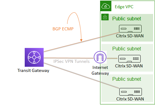 The VPN attachment approach allows you to interconnect the Citrix SD-WAN and Transit Gateway with IPSec VPN tunnel, and leverage BGP for dynamic routing for automatic failover. But the maximum throughput is 1.25Gbps per VPN attachment.