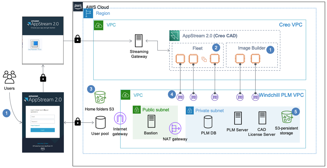 Figure 1 – Reference architecture of Creo CAD on Amazon AppStream 2.0 integration with Windchill PLM.