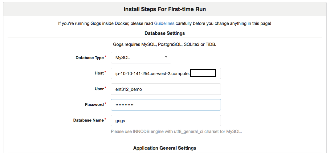 The custom DMS task we created in CloudFormation depends on the Gogs DB being present, so you must install and configure Gogs before the CloudFormation stacks complete. (At the time of this writing, CloudFormation does not support DMS resources, but we wanted to show you one particular way to build automation around certain aspects of your migration.)