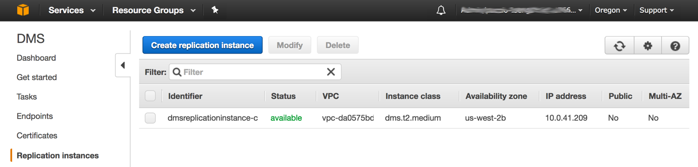 When you see that the DMS stack in CloudFormation is complete, you can inspect the setup. You should see a replication instance: