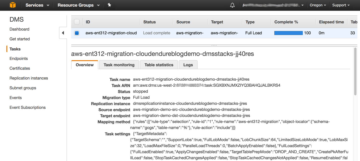 2. AWS DMS migrates the Gogs source DB server to the destination RDS instance.
