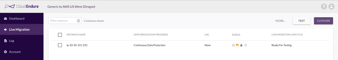 4. Once CloudEndure has completed the initial sync, their Continuous Data Protection (CDP) engine commences a real-time sync of any new data and the server is marked as ready for testing in AWS. The CloudEndure.py script then initiates the migration based on the hosttomigrate variable in the config.yml file. (This variable appears as Instance Name in the CloudEndure dashboard.)