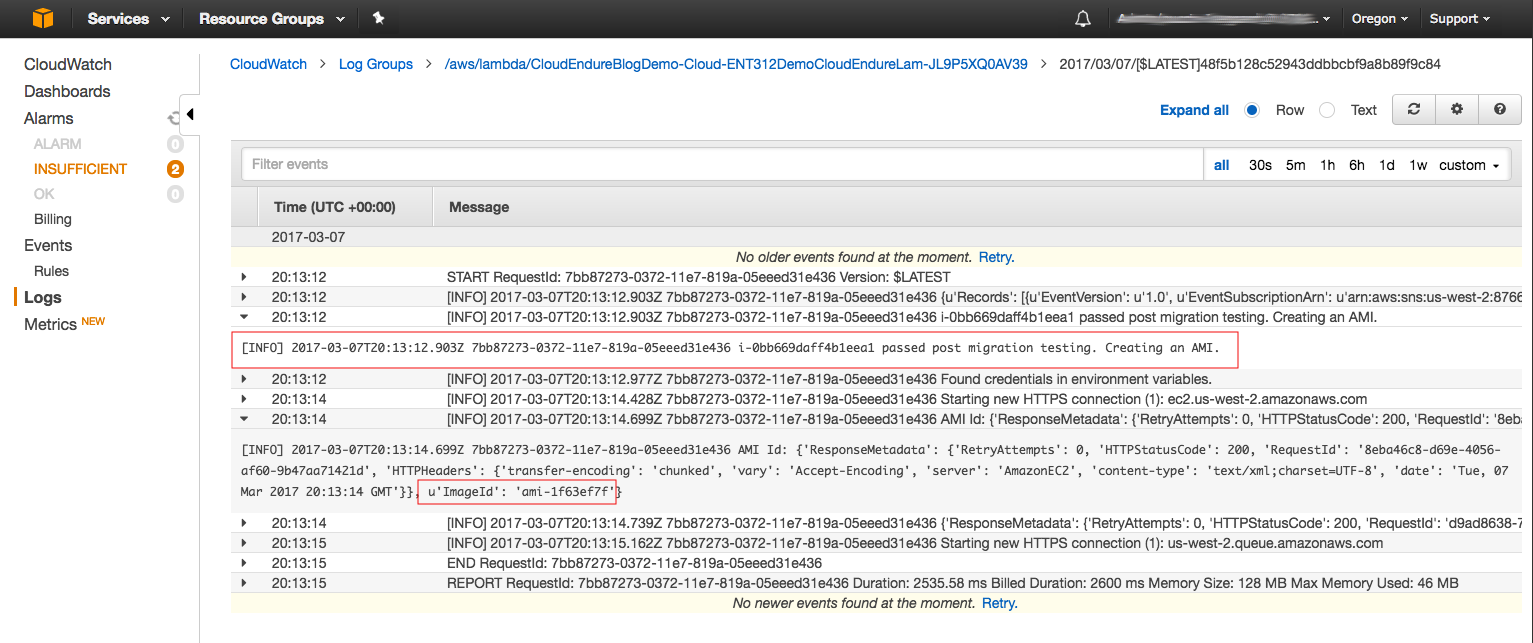 c. The CloudEndure Lambda function is subscribed to the CloudEndure Pass/Fail SNS topic. The Lambda function looks for a success message. If it receives a success message, it creates an Amazon Machine Image (AMI) based on the incoming instance ID and posts the AMI information in Amazon SQS. You can track the status in CloudWatch for the Lambda function: