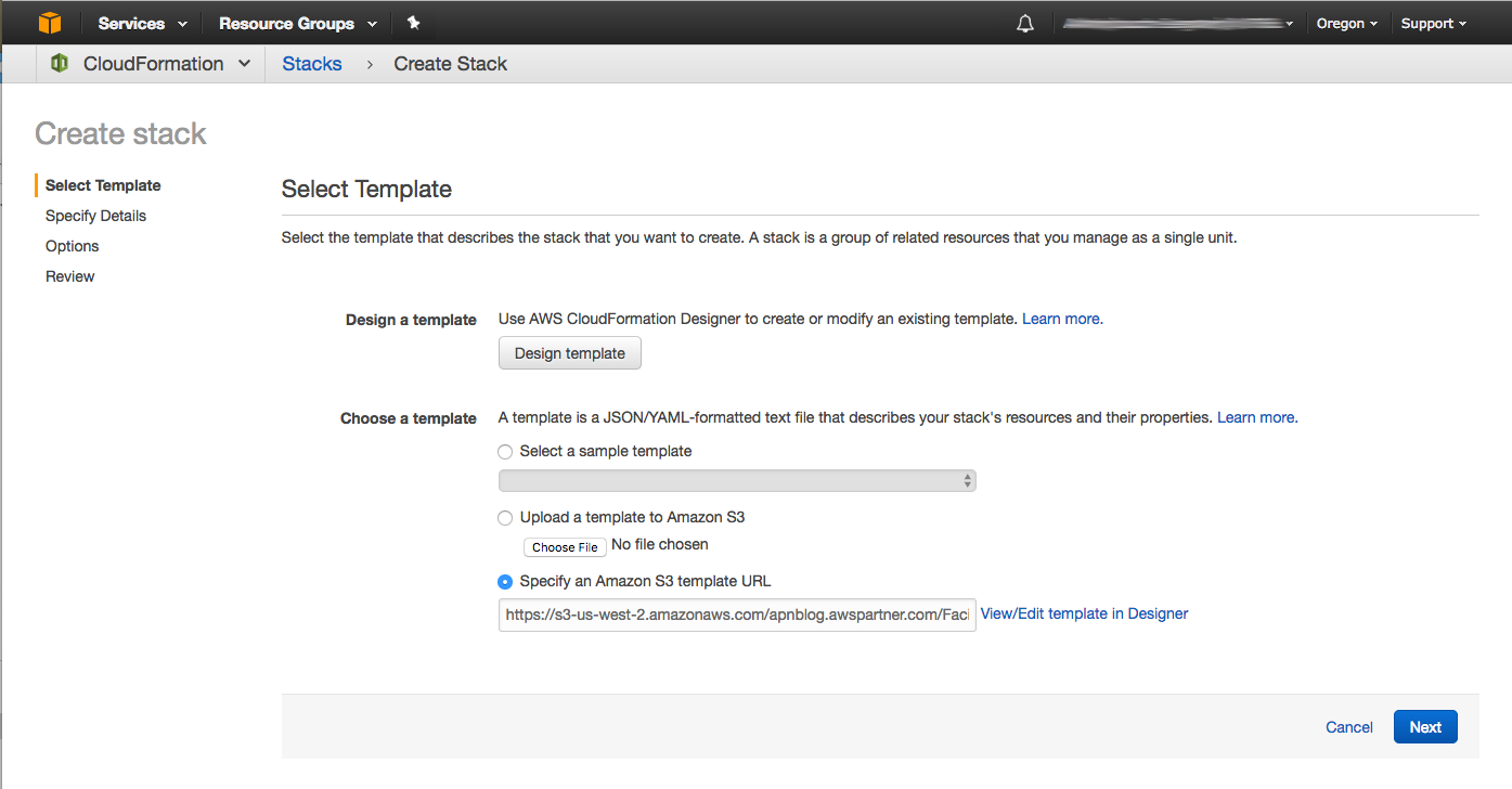 On the Select Template page, keep the default setting for the template URL, and then choose Next.