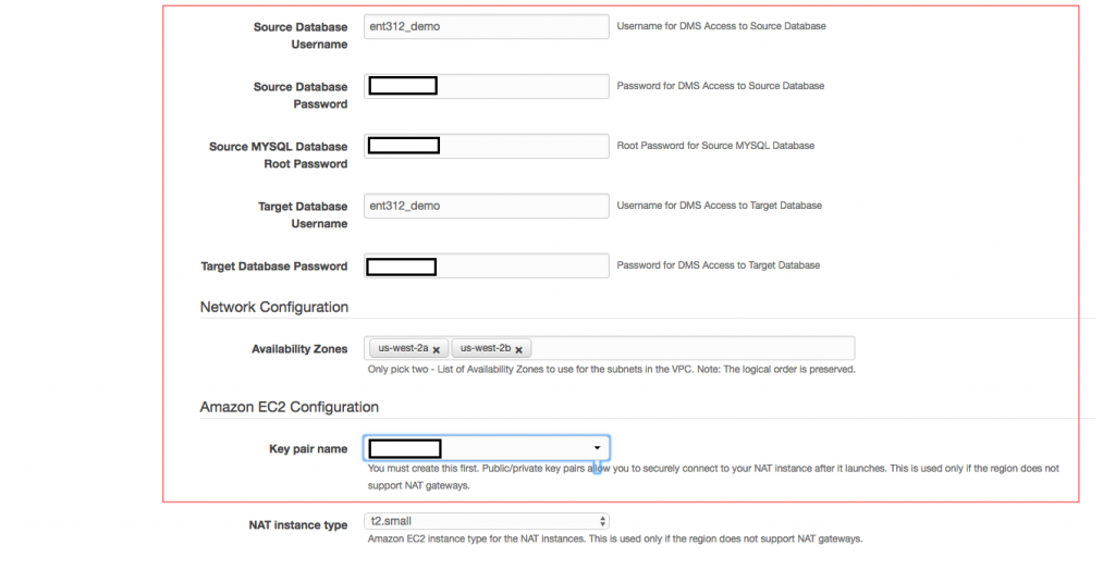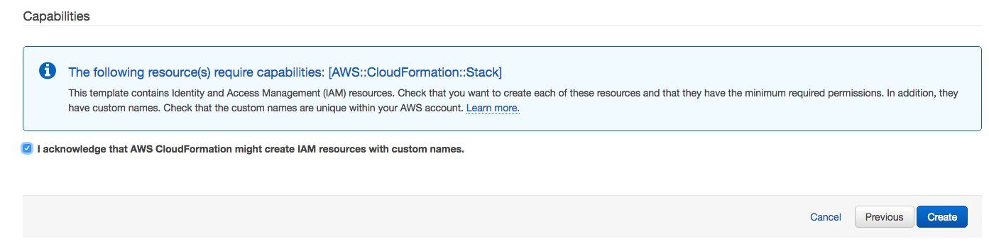 Take note of the values you set for Source Database Username and Source Database Password as you will need these when you configure Gogs. Choose Next and Next again on the following two screens and check the box that says “I acknowledge that AWS CloudFormation might create IAM resources with custom names.” Then choose Create.