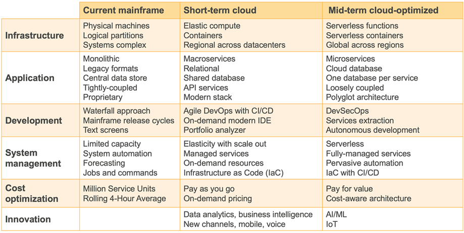 This highlights some of the technical changes in areas such as infrastructure, application, development, system management, cost optimization, and innovation. It shows the changes when moving from the mainframe to cloud in the short-term, and changes when optimizing on the cloud.