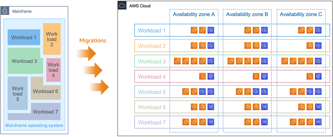 As shown in Figure 4, mainframe workloads are migrated iteratively. Each workload typically ends up with dedicated resources for compute and data on the AWS side. We prioritize workload migration based on business criticality, technical complexity, integration points, and business value. Over time, we strangle the mainframe workload by workload.