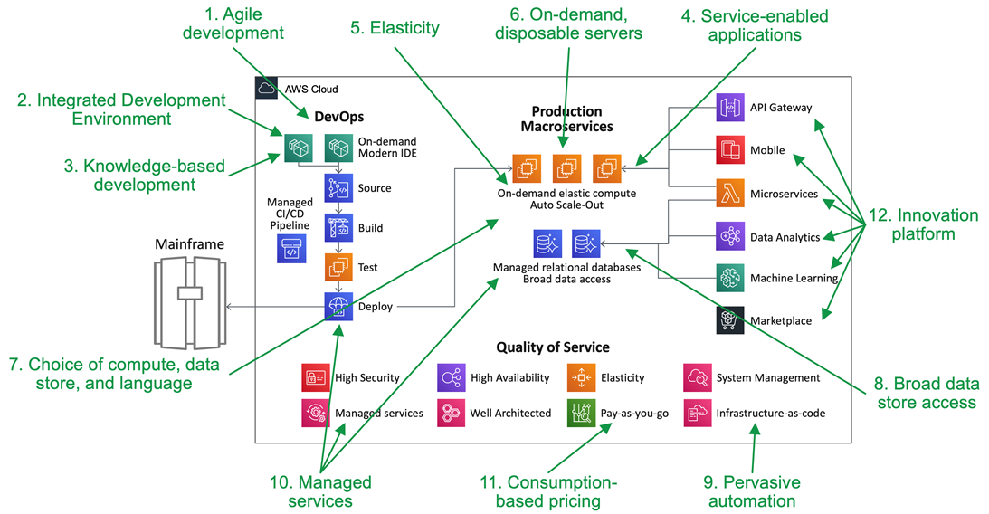 You can read about the specific AWS services providing agility in my post: Accelerating Agility with 12 Attributes for Mainframe Workloads.