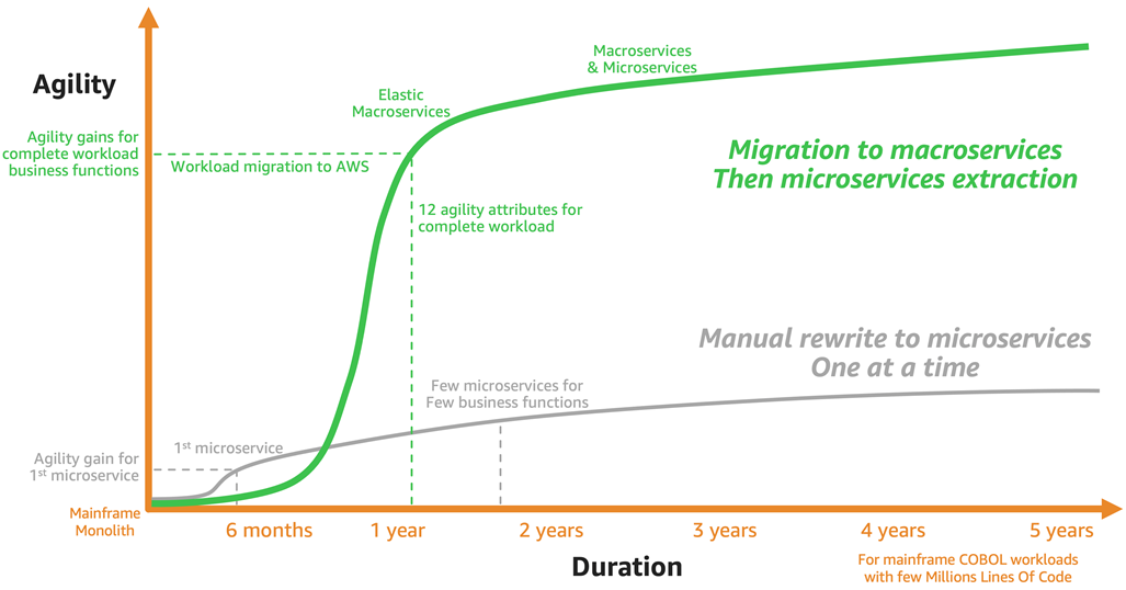 The macroservices-then-microservices approach with AWS accelerates agility for a large scope of business services. This is the fast track to agility for a mainframe workload.
