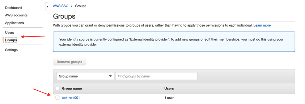 - In the AWS SSO console, go to the Users and then Groups tabs and make sure the users and roles you set up in CyberArk Workforce Identity are showing with the correct attributes.