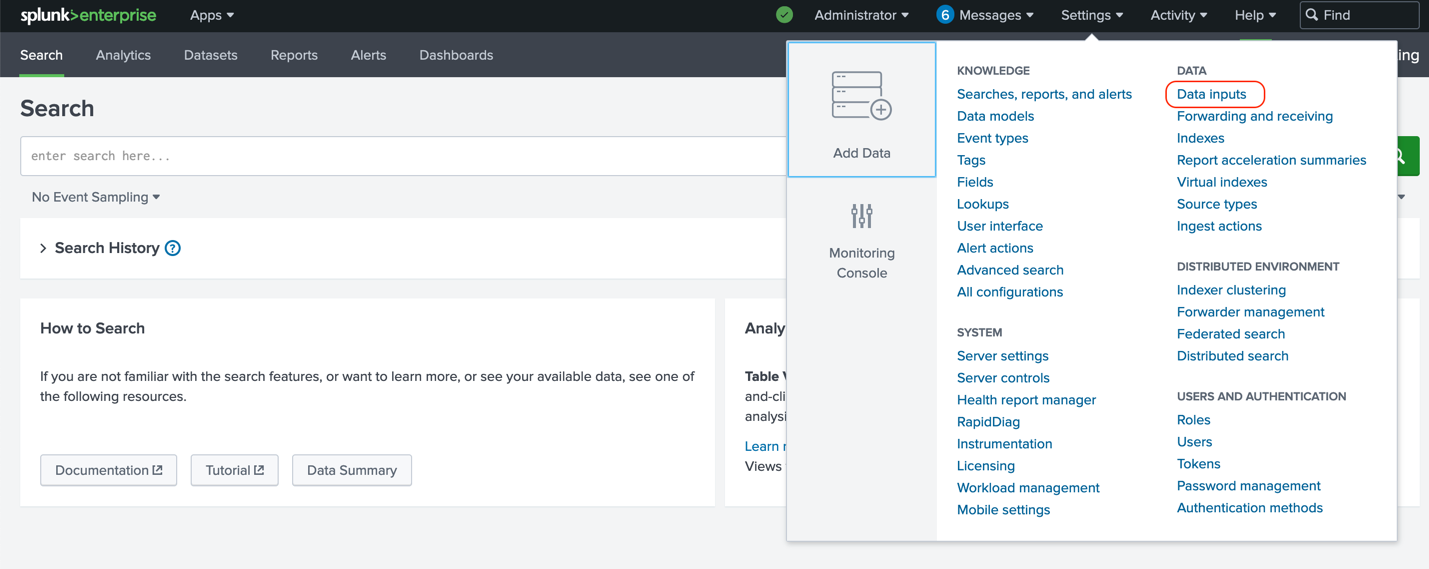 • Access Splunk web, go to Settings, and choose Data inputs.