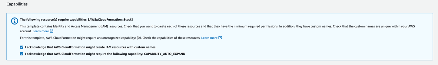 - On the Review page, review and confirm the template settings. Under Capabilities, select the check box to acknowledge the template creates IAM resources.