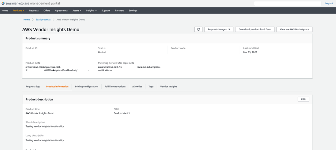 When the integration is complete, you will be able to see your product listing within the AWS Marketplace Management Portal (AAMP) under SaaS products. The “Limited” status allows you to enable testing and configuration before you go live. When you click on your product, you’ll see the information you entered during registration.