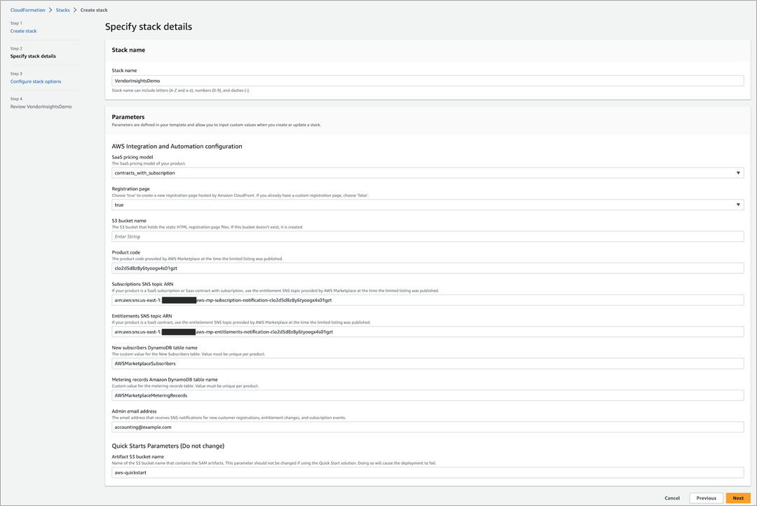 - On the Specify stack details page, provide a stack name. When you registered, the AWS Marketplace team provided you with your 25-character product code and the Subscription and Entitlement SNS Amazon Resource Name (ARN). Those in the figure below are for demonstration purposes only.