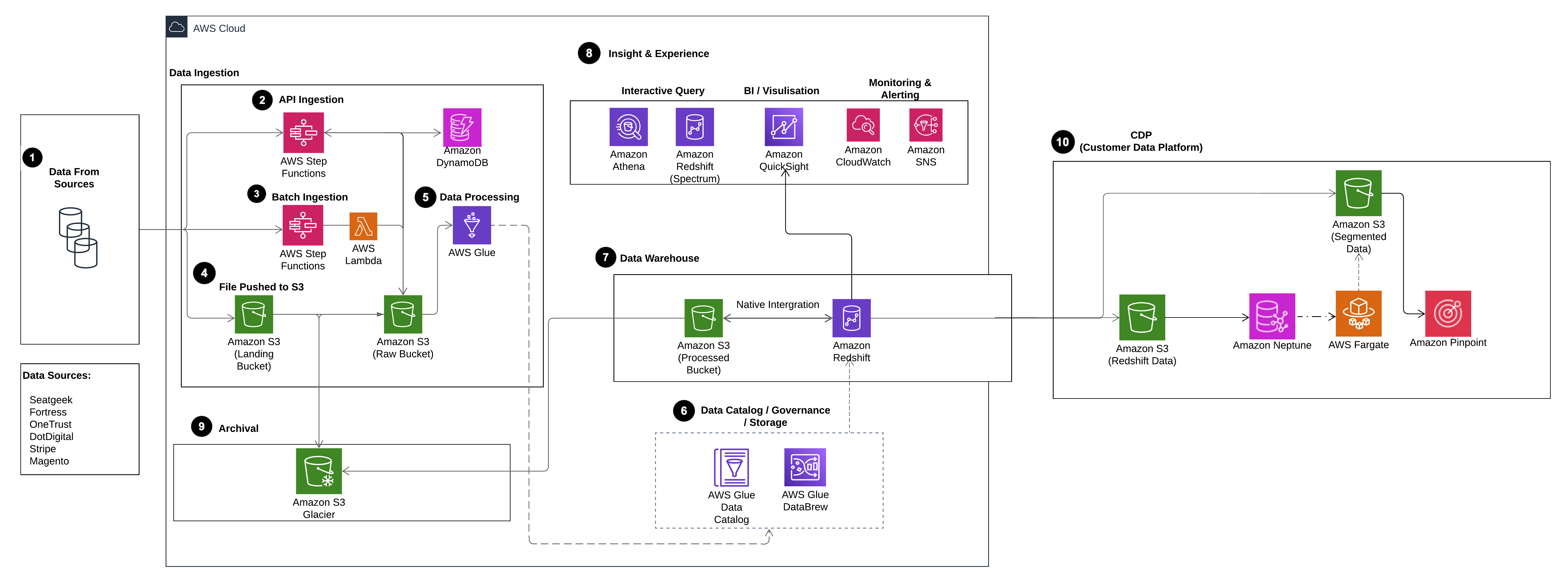 The following architectural design is for Slalom’s fan data platform accelerator, which can be found in AWS Marketplace, and outlines how AWS services have been leveraged to implement the accelerator.