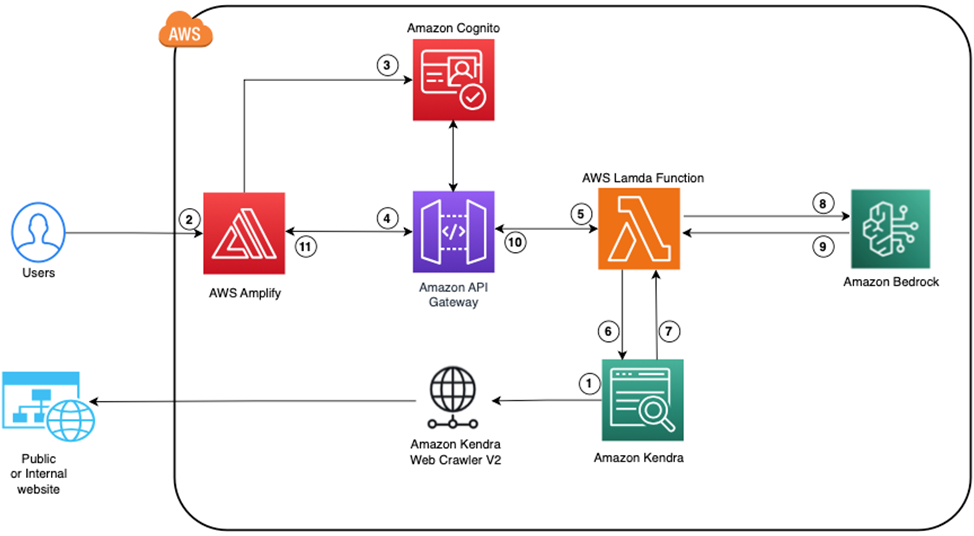 Cognizant’s solution in this post uses Anthropic’s Claude v2 large language model (LLM) for providing the conversational question and answer (Q&A) experience. A web-based chat application is built and hosted in AWS Amplify which sends user queries to Amazon Bedrock through Amazon API Gateway and an AWS Lambda function. Amazon Cognito is used for authentication and access control for the application, while Amazon Kendra is used for indexing company’s internal and external web content.