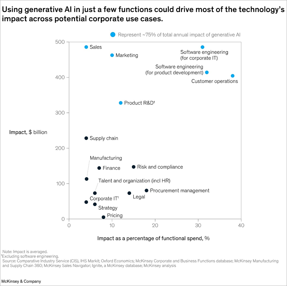 McKinsey: The research in the whitepaper “The economic potential of generative AI” estimates it could add the equivalent of $2.6-$4.4 trillion annually across 60+ use cases we analyzed. About 75% of that value falls across four functional areas: customer operations, marketing and sales, software engineering, and R&D.