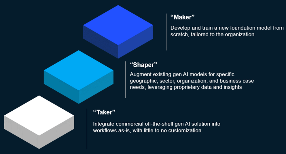 We see three archetypes for deploying generative AI solutions based on the talent, tools, and budget available: takers, shapers, and makers.