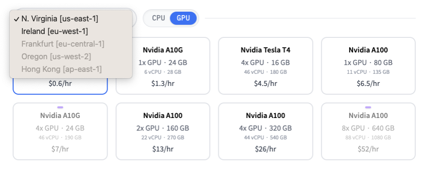 Select an AWS region close to your data in compliance with your requirements (such as Europe, North America, or Asia Pacific) and also select CPU/GPU instance types from the list.