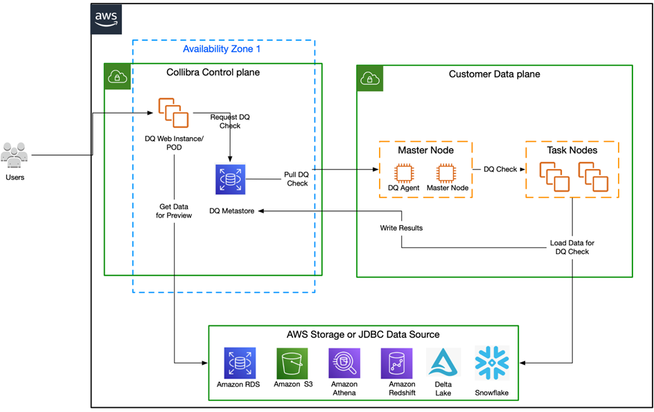 - DQ web instance: A 2-4GB Amazon Elastic Compute Cloud (Amazon EC2) instance to support an interactive user interface (UI), interaction between users and Collibra DQ, and a robust set of APIs for automated integration.