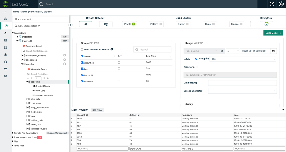 . - Implement Fit-for-Purpose DQ: Deploy the fully distributed DQ architecture with the right capacity planning. Onboard the dataset by running a simple profile first. Add a Date (${rd}) to the select query to make this a time series check for end-to-end data observability across pipelines.