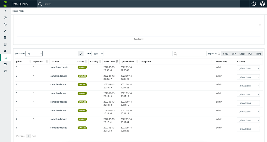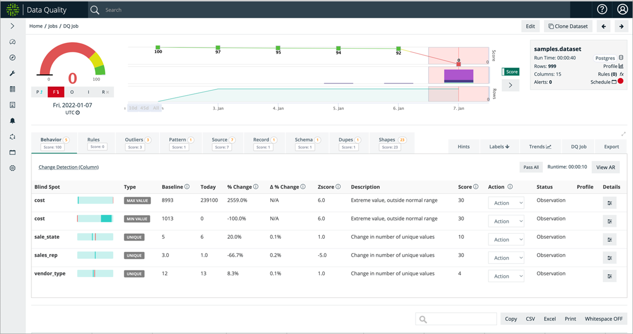 Run the job 5-7 times on good sample data to form the baseline, understand the output, and stabilize the Collibra DQ check. Automatically uncover data drift, outliers, patterns, and schema changes, and add them to Collibra DQ Scan.