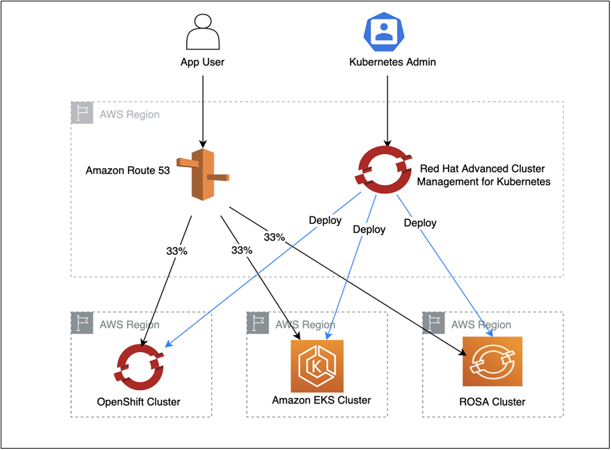 This post explores how to import three clusters (Amazon EKS, OpenShift, and ROSA) into Red Hat Advanced Cluster Management, with ROSA as the hub cluster. It walks through deploying an application using Red Hat Advanced Cluster Management onto all three clusters, and creating a disaster recovery solution (active-active) using Amazon Route 53.