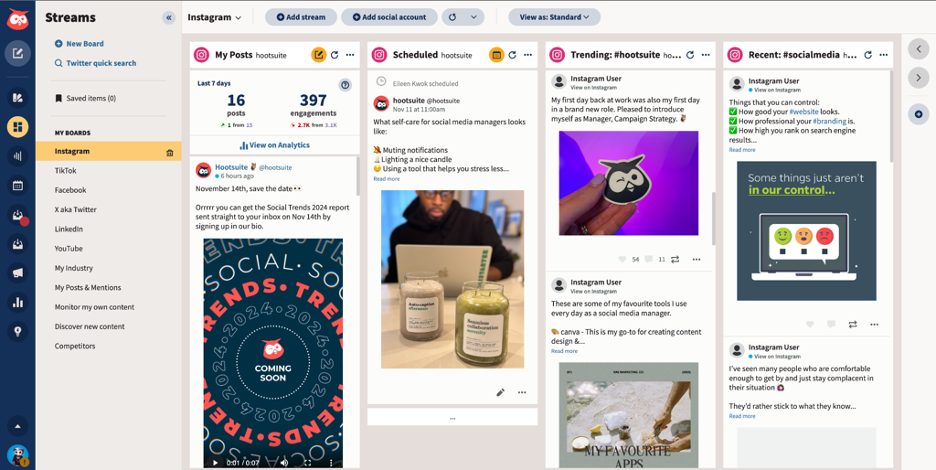 Hootsuite provides a robust social media management platform for you to conveniently manage multiple social media profiles. The platform enables users to post content to multiple social media profiles at the same time and view analytics data for their profiles in a single dashboard.