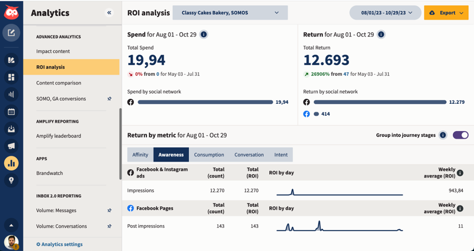 Hootsuite Advanced Analytics also offers the capability to customize analytics and set up sophisticated reports based on business needs. You can customize analytics by setting up custom metrics and ROI metric profiles.