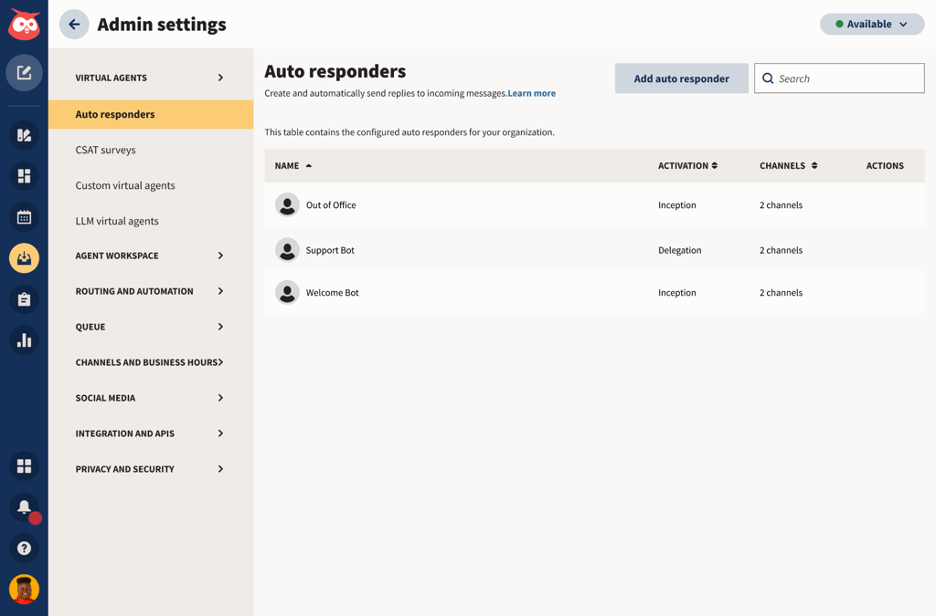 Admins have the ability to configure agent workspaces, set up virtual agents, set up auto-responder scripts, create and send customer satisfaction (CSAT) surveys, route conversations to agents based on skill set, and monitor the performance of your agents, teams, channels, and topics in real-time.